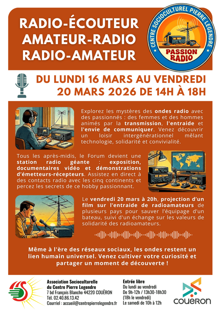 Du lundi 16 au vendredi 20 mars 2026, le « Centre Socioculturel Pierre Legendre » (association d’Education Populaire, public intergénérationnel) de Couëron Loire-Atlantique (ou je suis bénévole et administrateur) accueillera, dans le Forum, une semaine d’animation intitulée « Explorez les mystères des ondes radio avec des passionnés ».